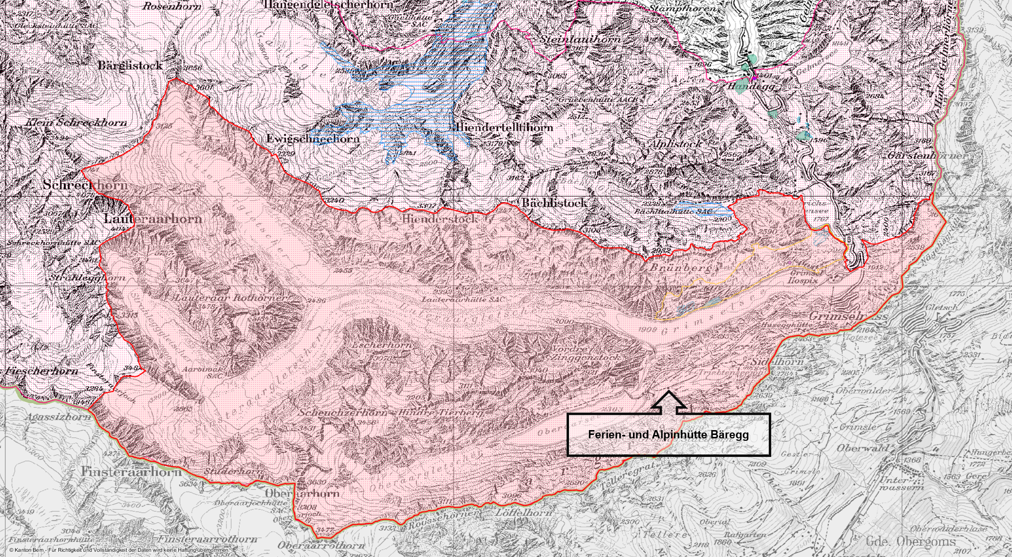 Die Bäregghütte liegt inmitten der grandiosen Bergwelt der Grimsel und Oberaar auf 2455 m ü. M. Das gesamte Gebiet zwischen Grimselpass, Sidelhorn, Oberaarjoch, Bärglistock, Bächlistock und Räterichsbodensee ist kantonales Naturschutzgebiet. Es beherbergt verschiedene geschützte Bereiche wie Moorlandschaften, Feuchtgebiete oder Wildschutzgebiete und grenzt an das Unesco-Weltnaturerbe Jungfrau – Aletsch.